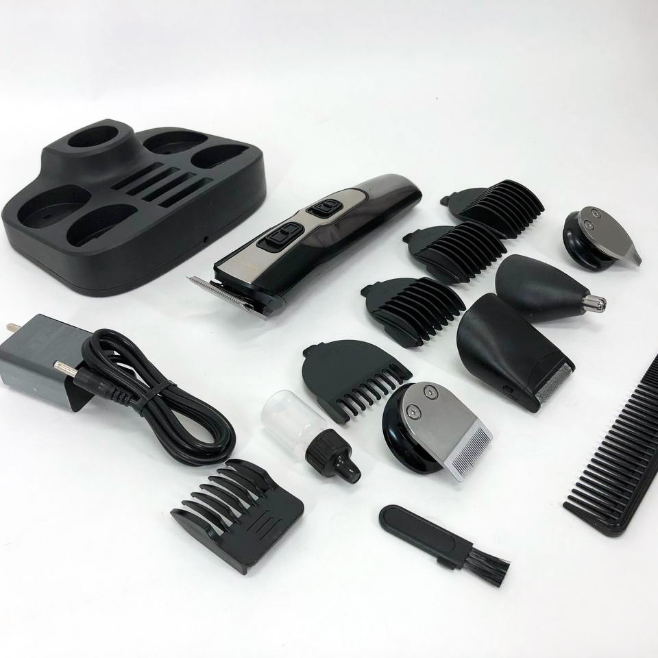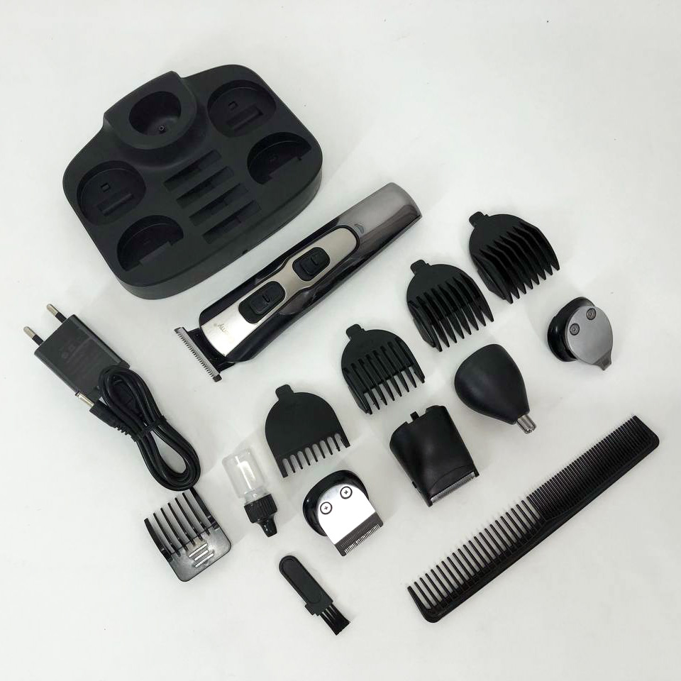 GEMEI GM-592 9 в 1 чудовий подарунок для сучасного чоловіка, який стежить за своєю зовнішністю та любить у всьому акуратність та організованість. На цільній підставці грамотно розташована сама машинка GEMEI GM-592 та супутні аксесуари. Кожна з наявних з десяти насадок у наборі має своє строге призначення, завдяки цьому комплекту чоловік може підтримувати в ідеальному стані свої вуса і бороду, регулювати довжину волосся, що зістригається, а також делікатно позбавлятися зайвого волосся в носі і вухах.