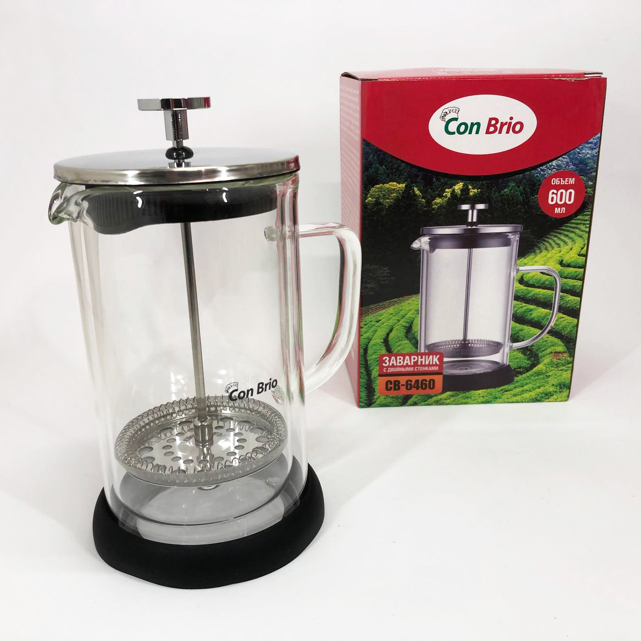 Френч-прес Con Brio CB-6460 об’ємом 600 мл виготовлений з термостійкого боросилікатного скла з подвійними стінками, які запобігають нагріванню зовнішньої поверхні та зберігають температуру напою на більш тривалий час. Високоякісний пластик додає міцності та довговічності конструкції. Розбірна конструкція забезпечує зручність у догляді, а елегантний та практичний дизайн робить заварник ідеальним для заварювання кави, чаю та трав.